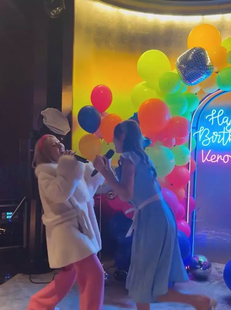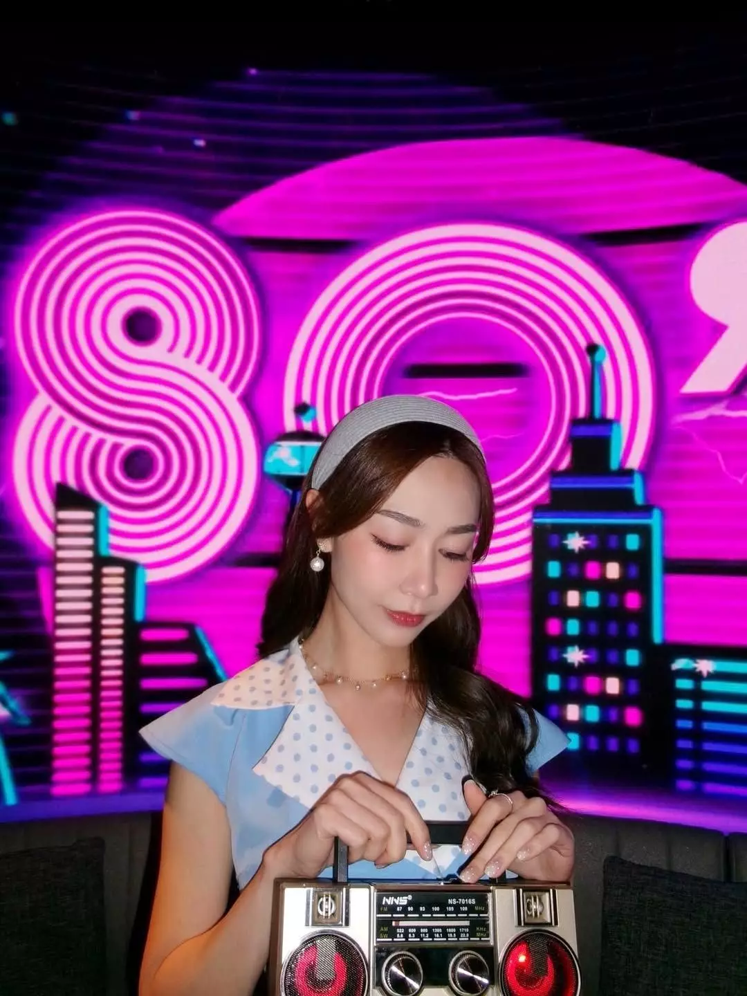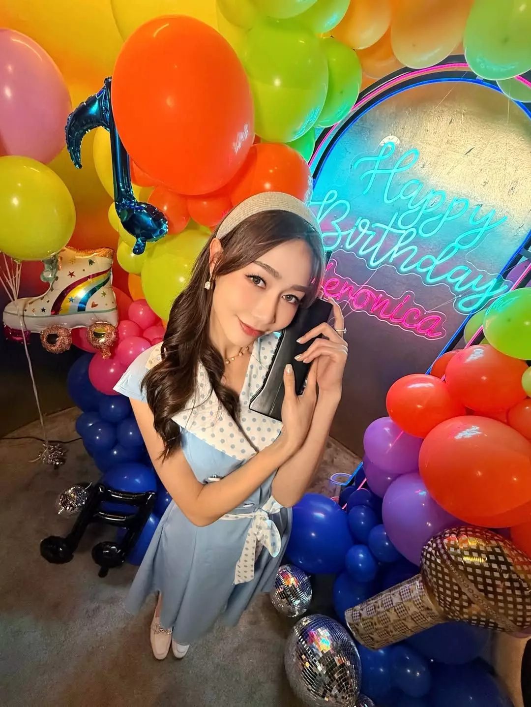 相中可見,派對以懷舊Disco為主題,黃嘉雯穿上藍白色波點連身裙,搭配粗邊髮箍,變身「陳寶珠」,而同場的譚嘉儀則一身Pink Lady打扮,二人又唱又跳,還拿着巨型收音機、「大哥大」及懷舊相機等道具擺pose拍照,相當有Feel!