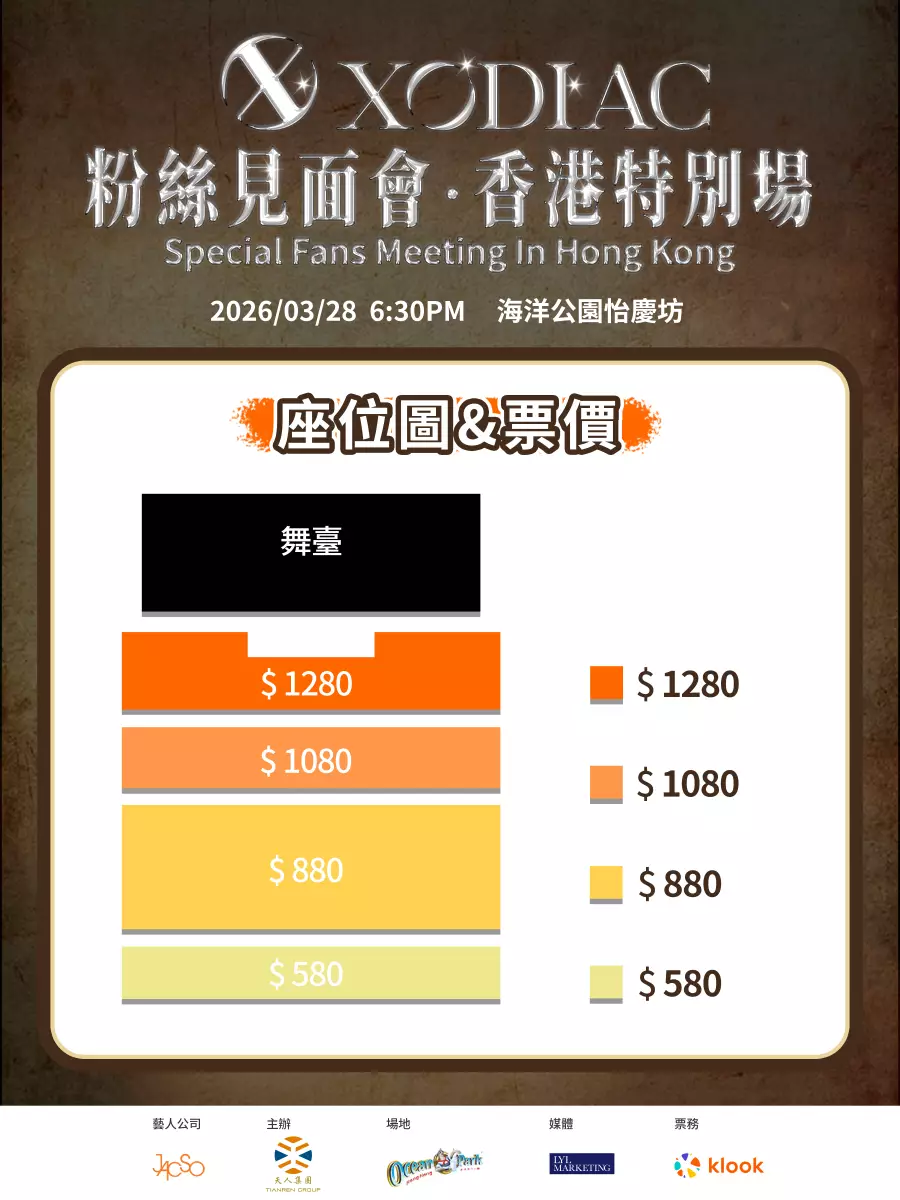 XODIAC將會為香港粉絲帶來不同歌曲及舞蹈表演、玩遊戲及與粉絲互動等等環節。見面會特別設計了豐富的粉絲福利,門票分為$1280、$1080、$880及$580 四種價位,對應不同層次的專屬體驗。所有票價均包含官方海報、擊掌(Hi-Touch) 及香港場特別紀念卡一套。