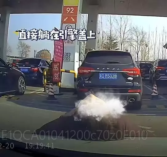 男車主加油遭陌生女子躺愛車引擎蓋上強行打尖勁無奈。影片截圖