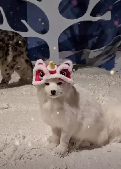 北極狐雕像戴上紅白舞獅頭飾,十分可愛。FB截圖