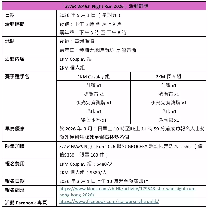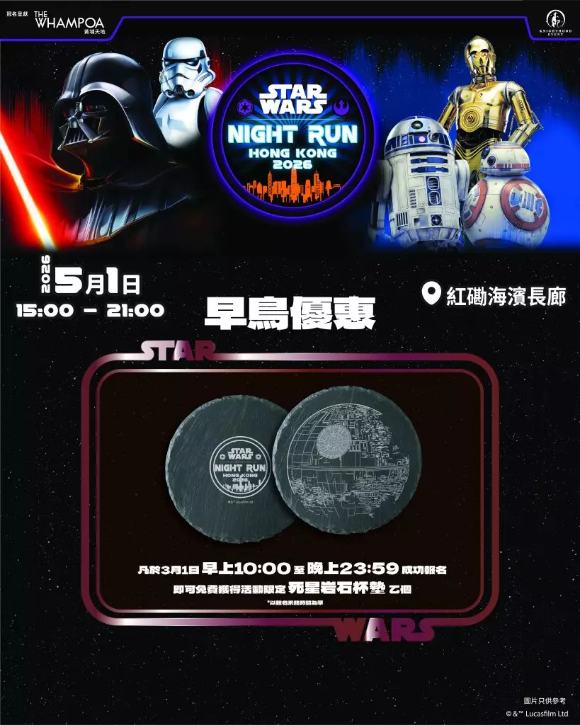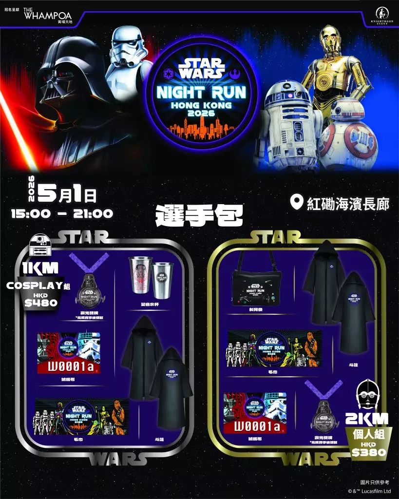 賽事分別設有1KM Cosplay 組與 2KM 個人組,不論是經驗跑手還是星球大戰粉絲都適合參與,專屬選手包更包含活動限定斗篷及夜光獎牌等以電影為靈感的獨家限定裝備,助你型格起跑,May the Force be with you!STAR WARS Night Run 2026 將於 2026 年 3 月 1 日(本周六)早上10 時開始接受報名,而於2026 年 3月1日早上10時至晚上11時59分前成功參與早鳥報名人士,將額外獲得別注版死星岩石杯墊。同場將於黃埔天地時尚坊及船景街舉辦「STAR WARS Night Run 2026嘉年華」,多款攤位遊戲讓你像絕地武士般進行原力訓練,現場亦會擺放多個打卡裝置,配合夜跑主題打造一個星球大戰迷絕對不能錯過的大型STAR WARS派對!