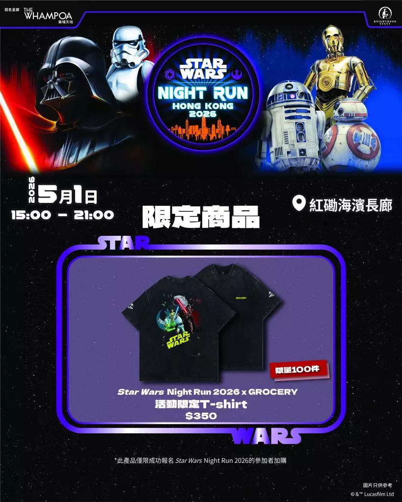 STAR WARS Night Run 2026 將聯同本地品牌GROCERY 推出全新活動限定T-shirt,重磅洗水布料加上經典對決時刻增添復古感。活動限定T-shirt限量100件,僅限成功報名參加STAR WARS Night Run 2026的跑手加購,手快有手慢無,所有星球大戰粉絲必定不能錯過此潮流單品