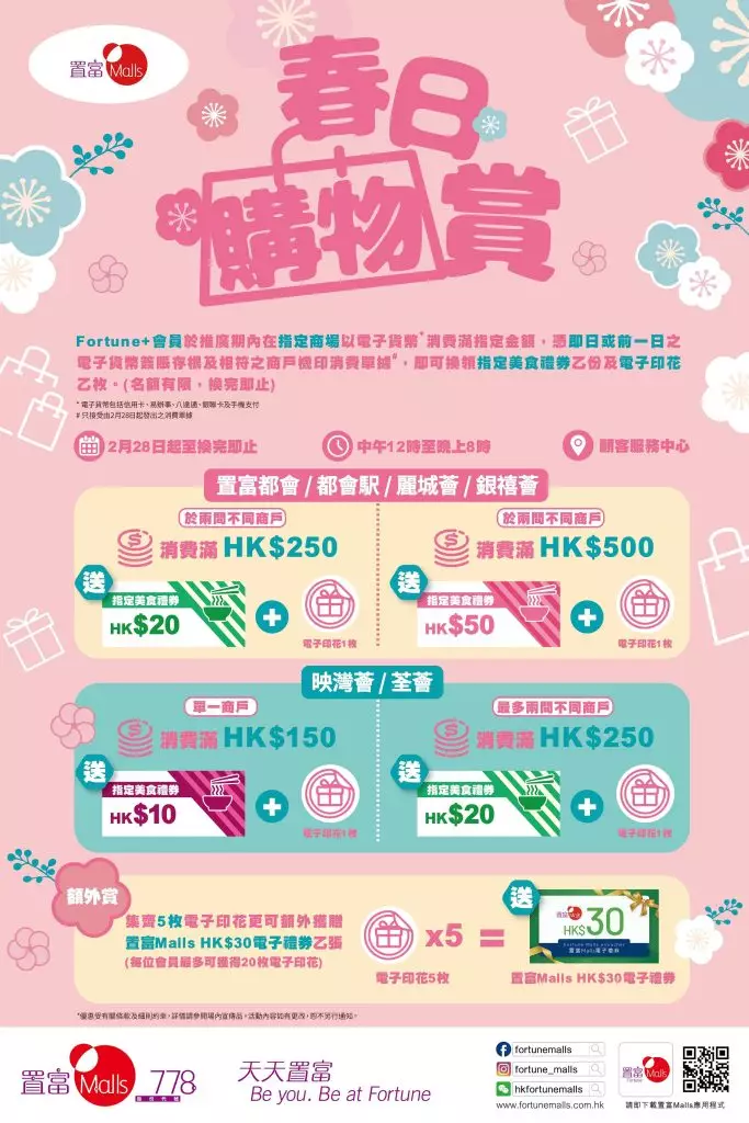 春季消費旺季,置富Malls於【置富Malls x SHO-CHAN置「燦」你迎新春】活動期間,特別推出「春日購物賞」,帶你踏進精明消費之道!由2月28日起Fortune+會員於指定置富Malls以電子貨幣消費,即可即時換領美食禮券及電子印花,集齊五枚電子印花更可額外獲贈置富Malls電子禮券,每一筆消費都化身成獎賞機會,春日購物更添驚喜!