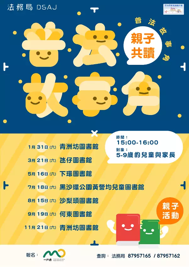 首場「普法故事角」已於1月順利舉行,其餘的場次將分別於3月21日、5月16日、7月18日、8月15日、9月19日和11月21日舉行,歡迎本澳5至9歲兒童及家長參加。活動已納入「百分百家長獎勵計劃」,有興趣者可透過一戶通的「活動報名」頁面報名,每場名額10對親子,如報名人數超過限額,將以電腦抽籤方式決定,詳情請參閱活動海報。如有任何查詢,歡迎致電法務局法律推廣及公共關係廳楊小姐(8795 7162)。