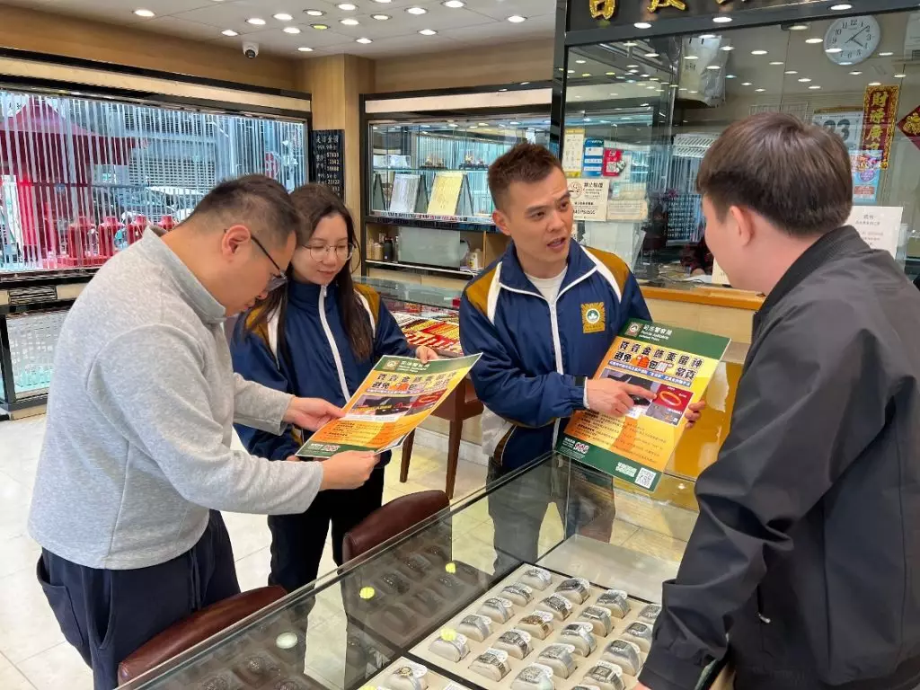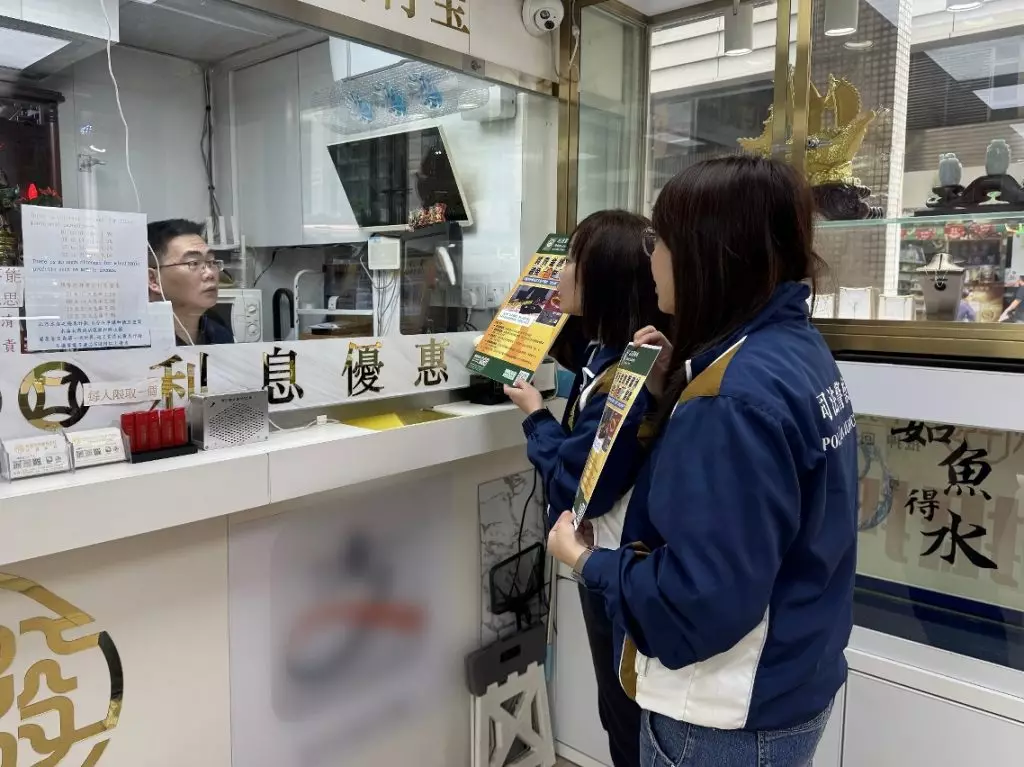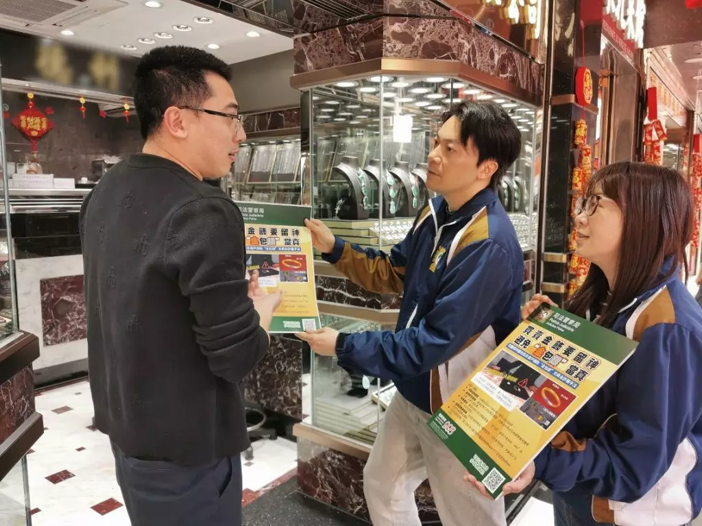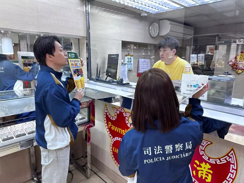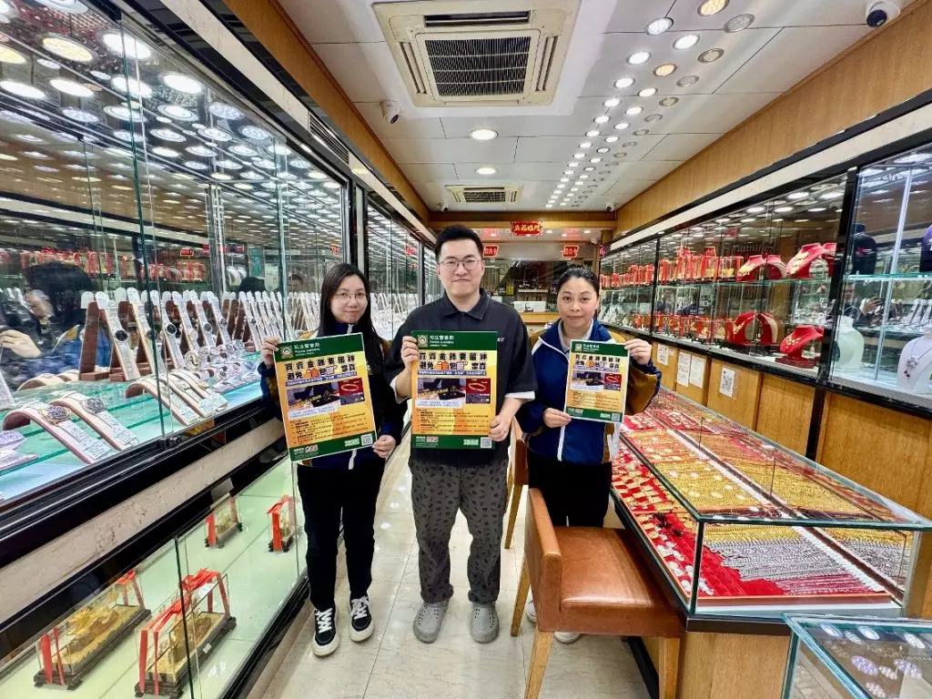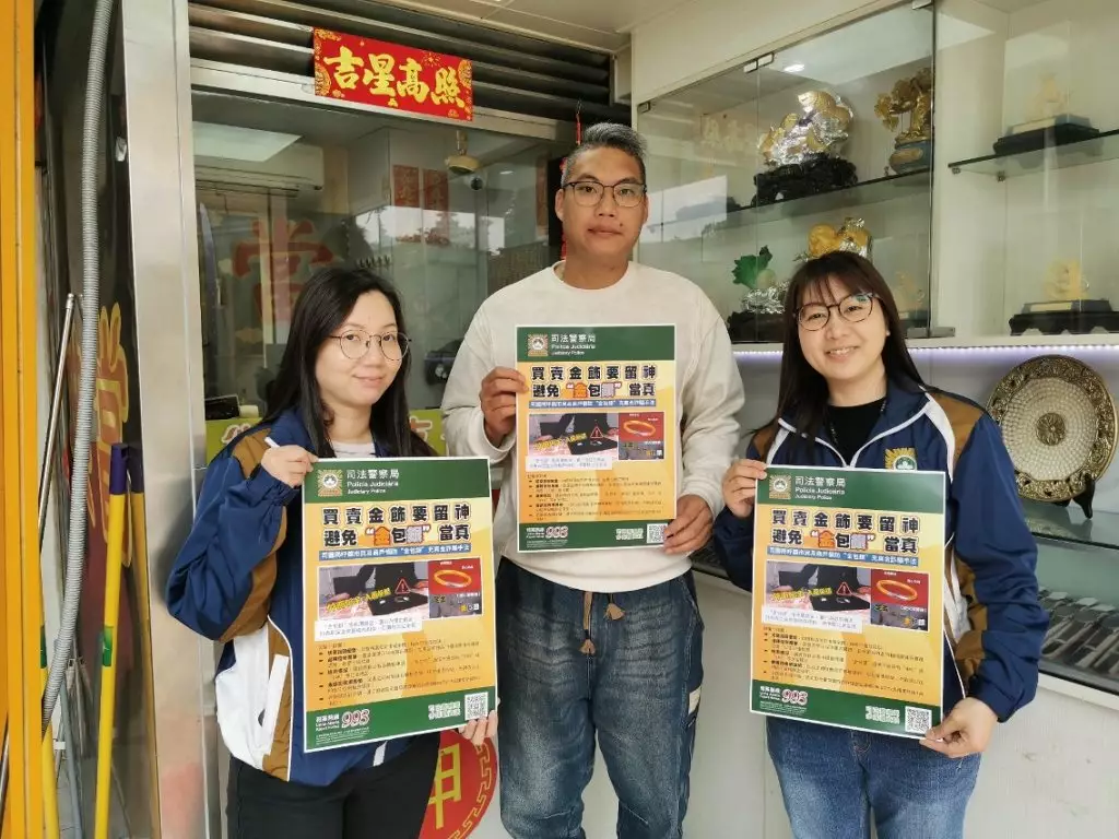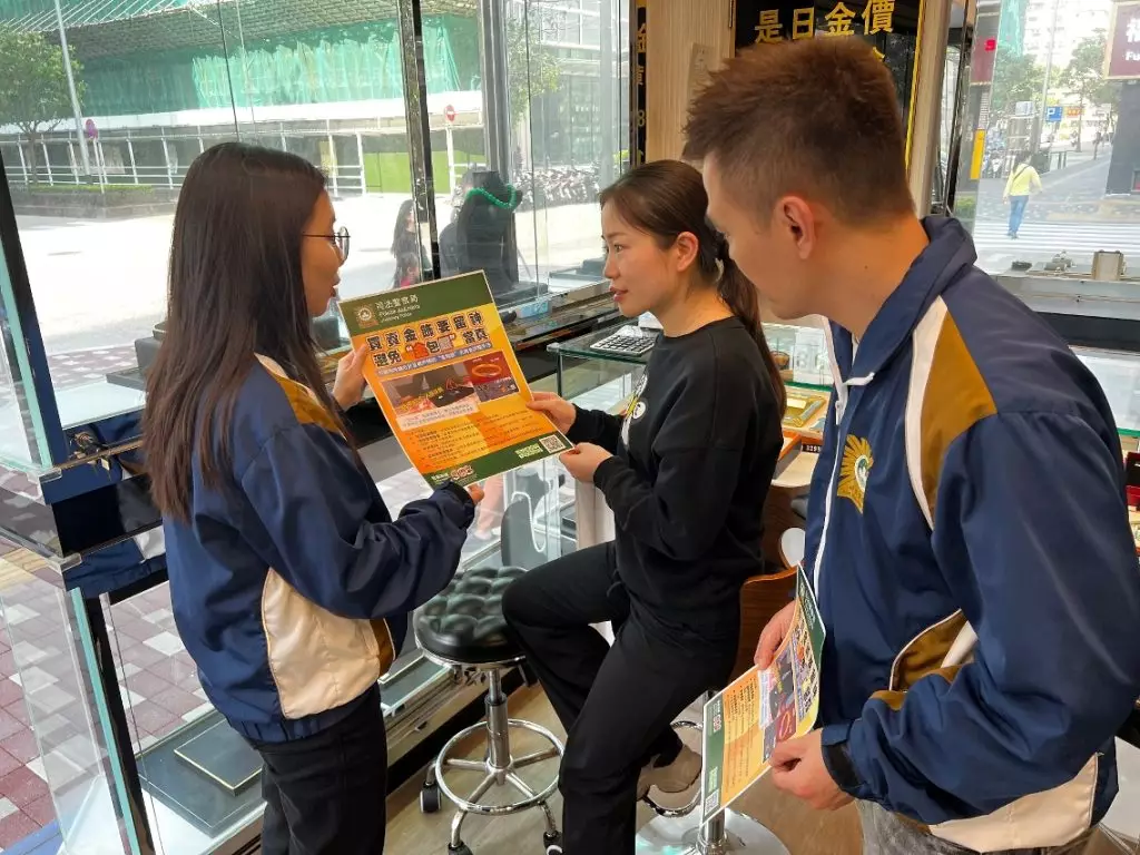 因應鄰近地區近日接連發生以「金包銀」假冒足金飾品進行詐騙的案件,為防範相關犯罪手法蔓延至本澳,保障從事黃金回收及當押業務商戶免受損失,司法警察局社區警務及公共關係處於2026年2月23日至25日期間,派員走訪本澳各區相關商戶展開專項防罪宣傳行動,加強業界對新型詐騙手法的認知與警覺性。是次宣傳共走訪約300間珠寶行及押店。