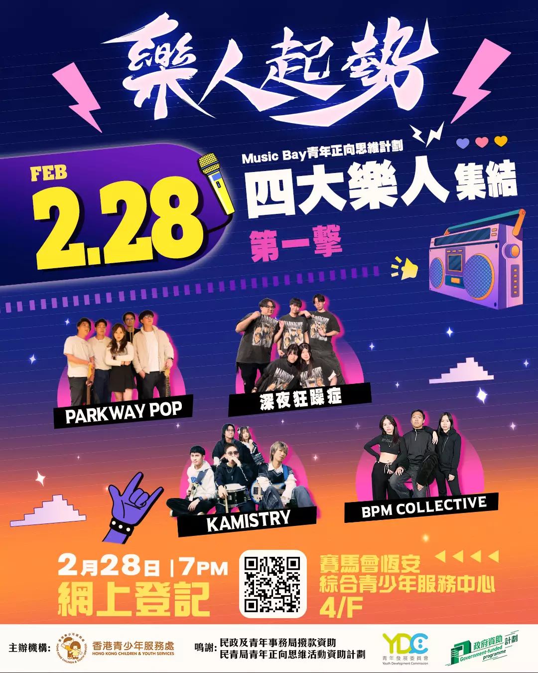 你聽過的好歌,不應只留在Band房;有潛力的年輕人,值得一個發光發亮的舞台。由香港青少年服務處主辦,民政及青年事務局及青年發展委員會撥款資助「民青局青年正向思維活動資助計劃」下的「Music Bay青年正向思維計劃」宣佈旗下核心地區活動 「樂人起勢」 將於農曆新年後強勢展開!計劃由 2026 年 2 月起,連續 12 個月舉行馬拉松式免費音樂 Showcase,集結59組本地音樂單位 ,誓要打破「香港玩音樂無出路」的悶局,為社區注入最強音樂能量。