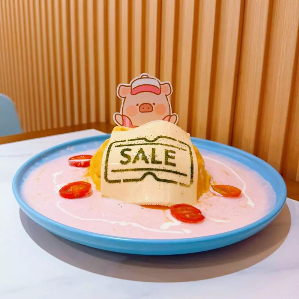明太子芝士蛋包飯HK$129,粉紅色的明太子醬如湧泉般佈滿整個蛋包飯,而芝士上亦特意配合SALE字眼,可愛滿分!