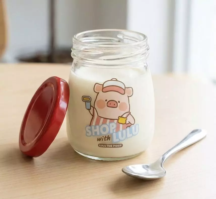 Lulu豬造型牛奶奶凍HK$48,整齊排列在玻璃瓶中的鮮奶布丁,瓶身印有 Lulu 豬圖案,口感滑順如冷藏櫃中的驚喜寶藏!