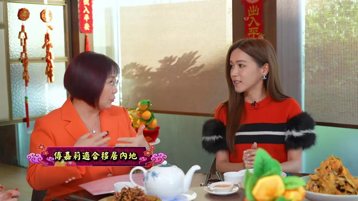 傅嘉莉坦言近年為了拍劇,經常到內地取景,有意搬上大灣區居住方便工作,玲玲師傅大表贊成,因為現在正行大運「九紫離火運」:「北面有郁動嘅星,所以不論係你或其他人,多往北面走動係好嘅。」肖鼠的傅嘉莉擔心今年「鼠馬相沖」,不過玲玲師傅叫她不用擔心,因為做藝人沖太歲反而是好事,更預測傅嘉莉有機會爆紅!至於姻緣,玲玲師傅指傅嘉莉感情宜「向外發展」,例如異地戀或跟外國人拍拖,並要低調拍拖才能開花結果。