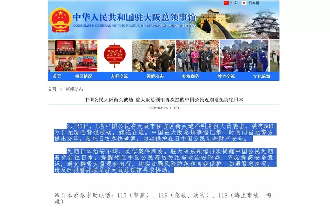 中國駐大阪總領事館已向當地警方提出交涉,要求日方盡快破案,切實保護在日中國公民生命財產安全。官網截圖