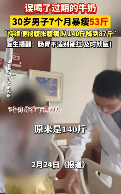 上海一名30歲男子因誤飲過期牛奶,導致嚴重腸阻塞,腸道功能徹底癱瘓,短短 7 個月內體重暴跌 26.5 公斤。