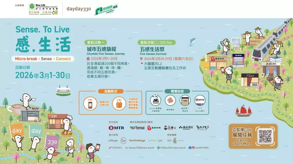 新生精神康復會(新生會)的公眾精神健康推廣活動dayday330 聯乘港鐵公司 (下稱「港鐵」)、譚仔國際旗下品牌譚仔雲南米線及譚仔三哥米線、誠品書店 (下稱「誠品」)、牧羊少年咖啡館,及旗下的新生農場及社企cafe330和so330 ,策動 「330 Day 2026」,將於整個三月期間在全港超過 200 個據點推出《感.生活》城市五感旅程,把整個城市化身成為感官遊樂場,為市民帶來嶄新生活體驗。