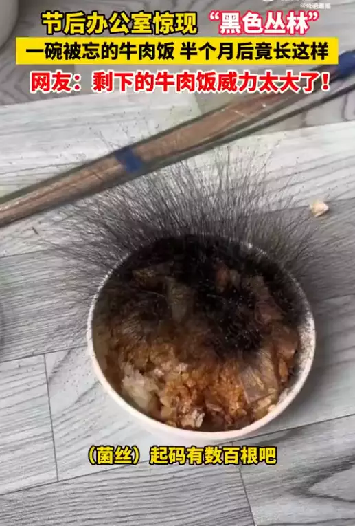 安徽省合肥市一名男子農曆新年返鄉,不慎將一碗吃剩的牛肉飯忘在辦公室,節後他返工,一股刺鼻霉味撲面而來,眼前景象更讓他震驚,碗中竟長出約15厘米高的「頭髮」,是密密麻麻的黑色菌絲,令人瞠目結舌。