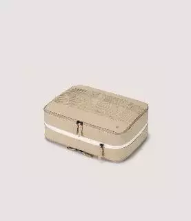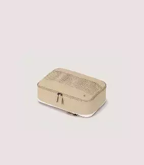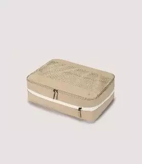 大碼壓縮收納袋以柔和米色為主調,適合走簡約風或大地色穿搭的旅人。袋身採用防水面料及 YKK 拉鍊,配合網格面層設計,衣物一目了然,將衣物壓縮收好又方便整理。