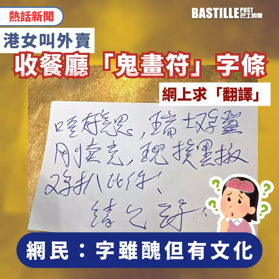 日前一名港女在網上撰文求助,指收到食肆送到的外賣後,還附贈一張店家手寫的字條,不過打開字條令她陷入迷茫,原來由於店家的字跡過於潦草,該名港女連蒙帶猜,勉強辨識出「瑞士雞翼剛賣完,現換黑椒雞扒比(畀)你」,但最後三個字過於抽象,令她百思不得其解,只好上網請求網民「翻譯」。