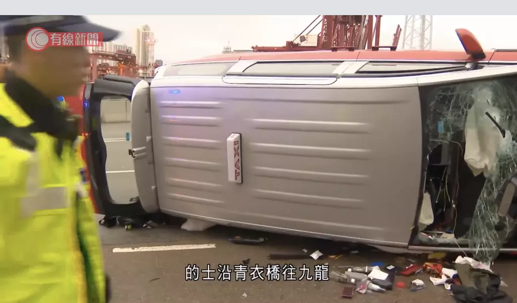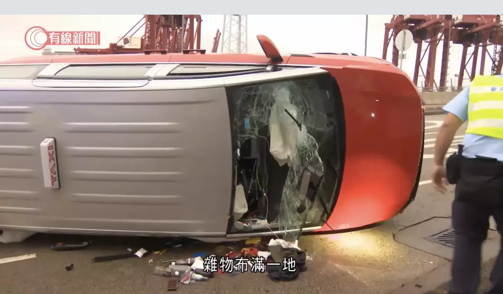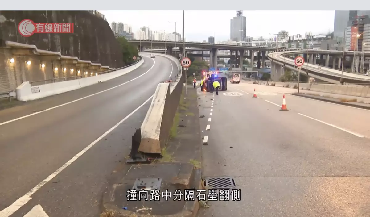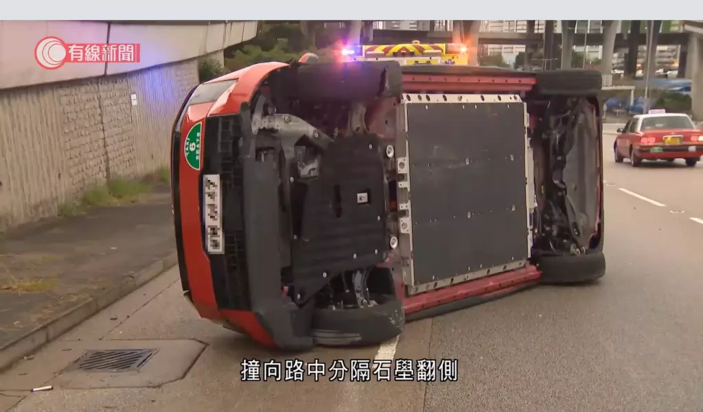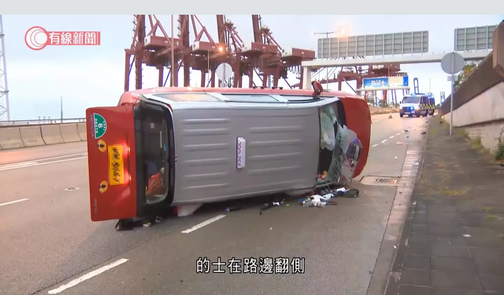 一輛的士在青衣葵青路向九龍方向行駛期間,懷疑因行錯線而撞壆,繼而翻側。有線新聞截圖