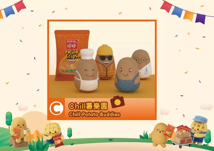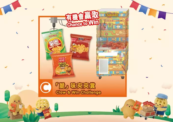 「脆」味夾夾賞集合打卡及夾夾機元素,放大版珍珍薯片超吸引眼球,Chill 薯萌友不倒翁,胖嘟嘟的身軀穿上牛仔工作服、廚師服、工程人員及實驗室白袍,顯露最具個性的一面,歡迎大家配襯一番,跟Chill 薯萌友們一起Selfie!在Chill 薯萌友旁邊,是從未退潮的「脆」爆夾夾機,讓大人小朋友大顯身手,夾走至美味的珍珍薯片食品,一家大小一起在夾夾機旁打氣助威,看看誰是夾夾高手!