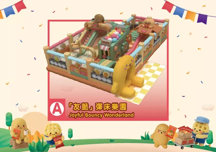 以薯片製造工房為概念,「友脆」彈床樂園設7個好玩關卡,近3.5米高巨形薯仔入口,以誠懇燦爛微笑等待各位跳進去玩樂打卡,當中必玩卡包括近4米高薯仔攀滑區、「薯仔浴池」巨型清洗區、薯仔切片焗爐、QC檢測區等等,大家快來一起協助各位小薯仔變身最脆最Fun的珍珍薯片啦!
