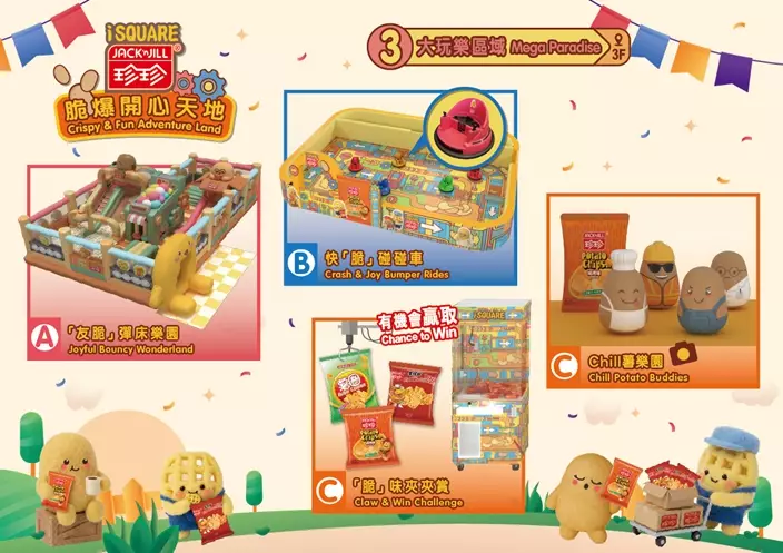 春風送暖,復活節假期即將來臨!今年iSQUARE國際廣場聯乘陪伴香港人成長的本地零食品牌Jack’n Jill珍珍薯片,於2026年3月28日起至5月10日期間,隆重呈獻「iSQUARE x Jack’n Jill珍珍 脆爆開心天地」,今年適逢珍珍薯片成立55 週年,iSQUARE國際廣場為大家在3樓 iFUNCTION準備 3大樂「脆」玩樂區域,而今次亦是三大薯仔萌友—小肥薯,薯格仔,小圈仔全球首次登場,3大萌友走入3 大區域,好玩內容包括:以薯片製造工房為主題的①「友脆」彈床樂園,至搶眼的有3.5米高巨型薯仔微笑入口,及4米高薯仔攀滑區,給小朋友種種體力挑戰,既能運動身體展開放電模式,同時又能讓大腦紓壓!再走到讓小朋友化身至「脆」小車手的②快「脆」碰碰車,童趣漫畫風圍欄及運輸帶賽道,色彩繽紛的「脆爆運輸部」,小朋友定必一眼愛上!坐上可愛碰碰車展示駕駛實力,齊齊「碰」出開心火花。大人小孩同樣興奮的③「脆」味夾夾賞,Chill薯萌友放大版珍珍薯片及不倒翁歡迎Selfie打卡,旁邊「脆」爆夾夾機讓大家大顯身手,夾走珍珍薯片食品,滋味趣味一百分!只需於活動日期內蒞臨iSQUARE國際廣場以電子貨幣單一消費達指定金額,即可換領遊戲券及夾夾賞代幣,大玩特玩,「脆」爆一整天,製造最開心的春日及復活節假期回憶!