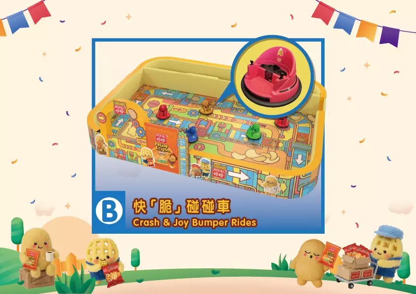 來到快「脆」碰碰車「脆爆運輸部」,3位萌友:小肥薯,薯格仔,小圈仔相伴小車手們在場景中穿梭,並在運輸帶賽道中展示最可愛駕駛者的「超萌」實力,快來一起參與賽事,做個最「脆」小車手!