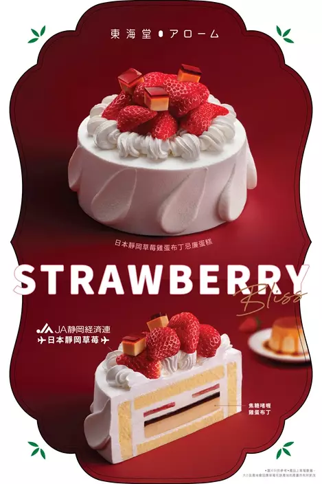 春日裡的靜岡風光明媚,2至3月更是草莓盛產的黃金時節,一顆顆色澤鮮紅、果肉飽滿、香氣四溢的靜岡草莓迎來大豐收,甜美氣息洋溢四周。有見及此,東海堂アローム即日起再次為一眾草莓控傾情獻上「Strawberry Bliss」蛋糕系列,主打兩款蛋糕:「日本靜岡草莓雞蛋布丁忌廉蛋糕」(6吋)與「日本靜岡草莓麻糬戚風蛋糕」(4.5吋),均採用靜岡縣新鮮現採、直送到港的紅臉頰與閃亮香草莓打造而成;前者口感香甜多汁,後者則散發淡雅果香,帶來雙重味蕾享受,完美滿足每一位草莓愛好者的甜蜜渴望。同場加映,全新推出的「草莓麻糬芭菲甜品」,融合多層誘人草莓配料,層層堆疊,甜而不膩,是午後悠閒下午茶的夢幻之選!
