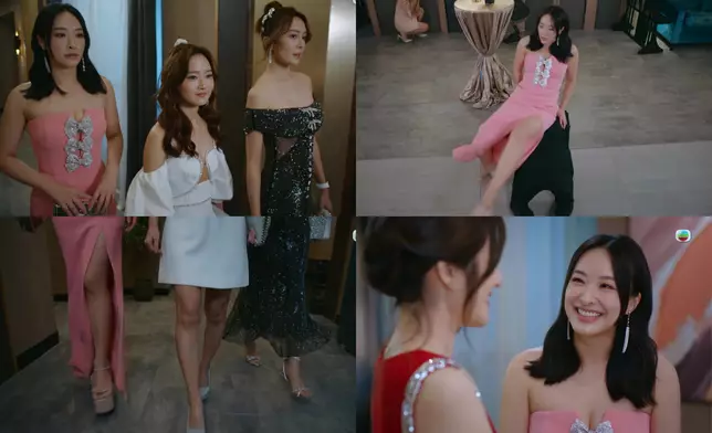 昨晚三嬌娃Dress Up勇闖豪宅派對一幕確實是亮眼環節,首先無論有「完美人肉衣架」張曦雯Kelly穿起的露肩半透視銀黑色晚裝、再有「黃金 32C」陳瀅的低調開胸蝴蝶結Pink Lady禮服,還有羅毓儀Yuki的性感不足、搞笑有餘的「外露打底」低胸晚裝,Yuki的「前衛」打扮,亦令網民留下記憶點;加上劇情講述Yuki被踢爆身份期間,嘗試以「童裝模特兒」做掩護,網民亦大感啜核,大讚其角色十分搞笑。