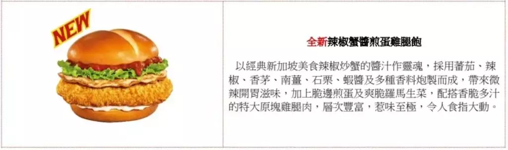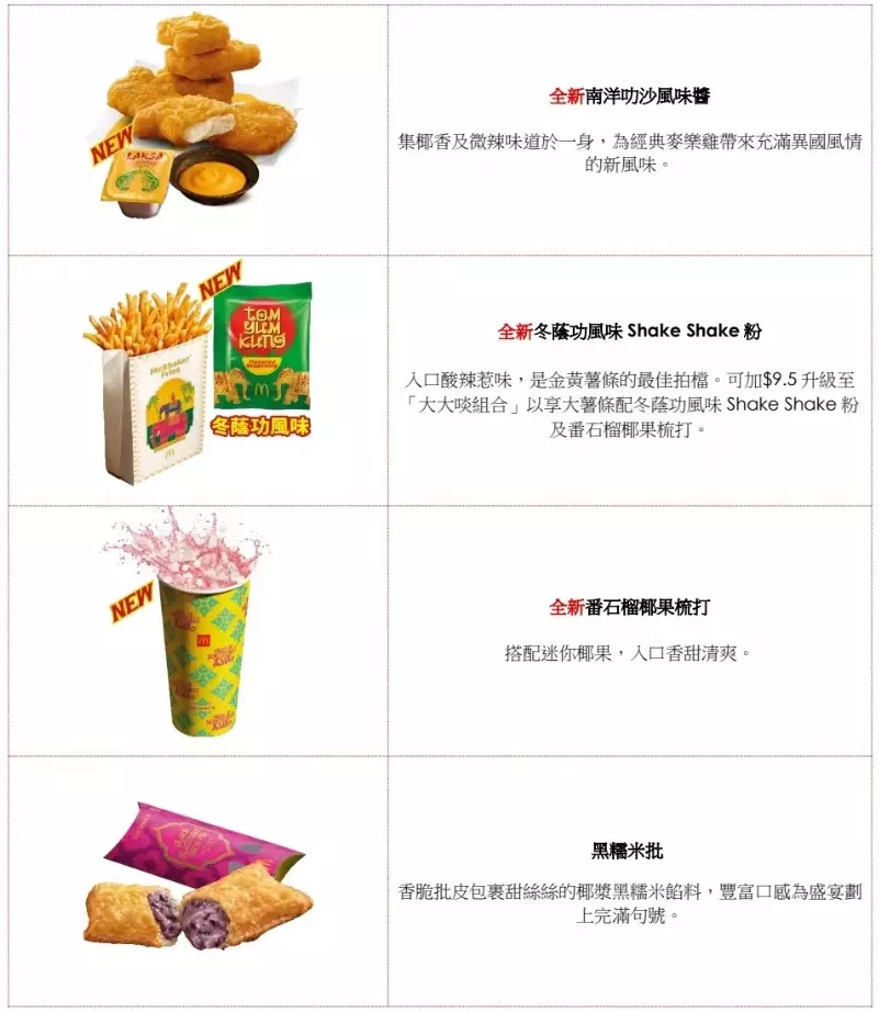 全新惹味東南亞系列美食集合星馬泰特色味道,包括新加坡代表:辣椒蟹醬煎蛋雞腿飽及南洋叻沙風味醬; 泰國代表:冬蔭功風味Shake Shake粉、番石榴椰果梳打及黑糯米批;來自馬來西亞人氣Number One辣辣麥炸雞。