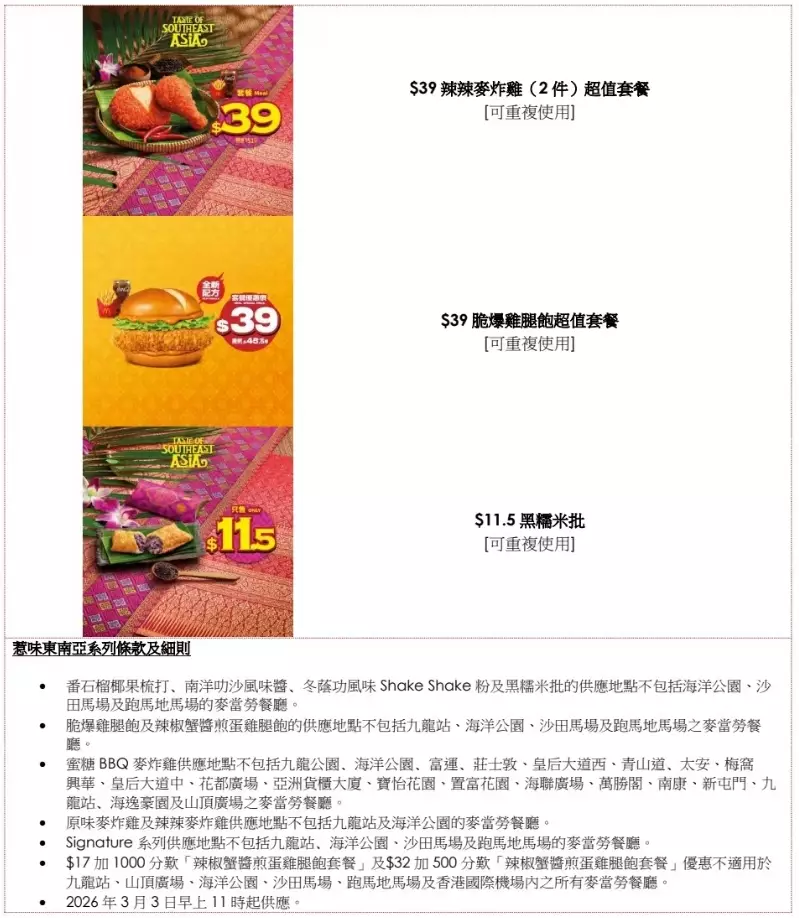 今個3月,香港麥當勞為大家締造星馬泰味覺之旅﹗由3月3日上午 11 時起,香港麥當勞隆重推出全新惹味東南亞系列,多款全新美食包括辣椒蟹醬煎蛋雞腿飽、南洋叻沙風味麥樂雞醬、冬蔭功風味 Shake Shake 粉、番石榴椰果梳打,以及再次限時登場的黑糯米批,為大家帶來一趟充滿新鮮感的味蕾旅行。