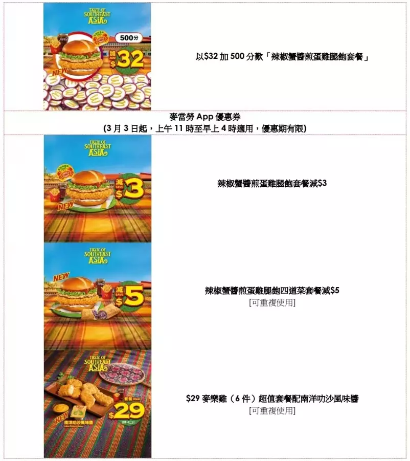 為慶祝全新惹味東南亞系列登場,麥當勞App亦推出「辣椒蟹醬煎蛋雞腿飽套餐減$3」及「辣椒蟹醬煎蛋雞腿飽四道菜套餐減$5」等優惠;大家亦可選擇「$29 麥樂雞(6 件)超值套餐配全新南洋叻沙風味醬」、「$39 脆爆雞腿飽超值套餐」、「$39 辣辣麥炸雞(2 件)超值套餐」及「$11.5 黑糯米批」。同時,更可加$9.5 升級至「大大啖組合」以享大薯條配冬蔭功風味Shake Shake粉及番石榴椰果梳打。麥當勞 App 用戶更專享積分獎賞優惠﹕只需以$17加1000分或$32加500分即享「辣椒蟹醬煎蛋雞腿飽套餐」。