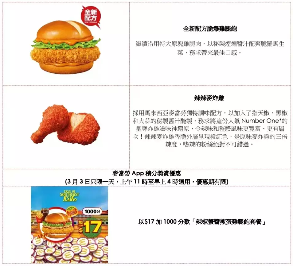 麥當勞 App 用戶更專享積分獎賞優惠:只需以$17 加 1000 分或$32 加 500 分即享「辣椒蟹醬煎蛋雞腿飽套餐」,試食只限3月3日一天;同日3月3日起,麥當勞App優惠將由推出一系列全新App優惠包括「辣椒蟹醬煎蛋雞腿飽套餐減$3」。新鮮感更加打孖上,三位喜劇演員包括白只、Dee 哥(何啟華)及阿卵(楊偉倫)首次聯手為麥當勞拍攝廣告,讓他們為大家擔任星級導遊,以幽默風格推介全新星馬泰美食,誠邀大家一人成團Gogogogogo,歡迎大家密切留意麥當勞官方 YouTube 頻 道 :https://www.youtube.com/@McDonaldsHK,欣賞他們精彩美食推介。同時,全新配方脆爆雞腿飽超值套餐再度上架,連同辣辣麥炸雞(2 件)超值套餐均以優惠價$39供應,無論到餐廳櫃檯或自助點餐機點餐,以及經麥當勞App購買均能享受此優惠。