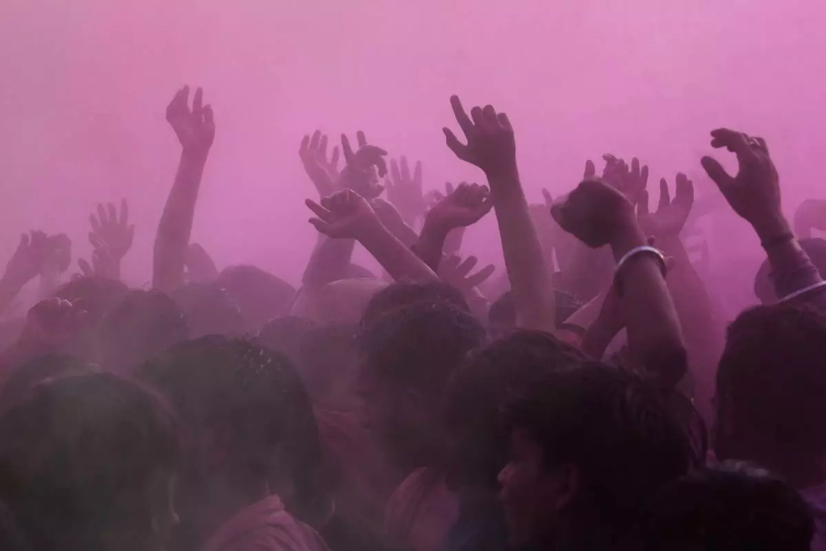 數百名男女信眾齊集於馬圖拉一間寺廟,該寺廟被視為印度教最受尊崇神祇之一克里希納神(Lord Krishna)的誕生地,而灑紅節亦與祂有密切關聯。眾人藉此慶祝象徵春天來臨的節日。