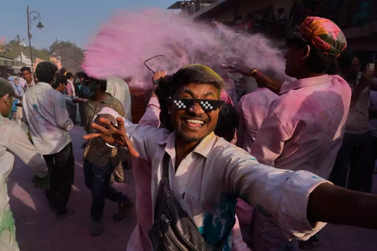 (美聯社)印度北部城鎮馬圖拉(Mathura)近日舉行灑紅節(Holi)慶祝活動,現場充滿音樂、舞蹈及漫天彩粉。