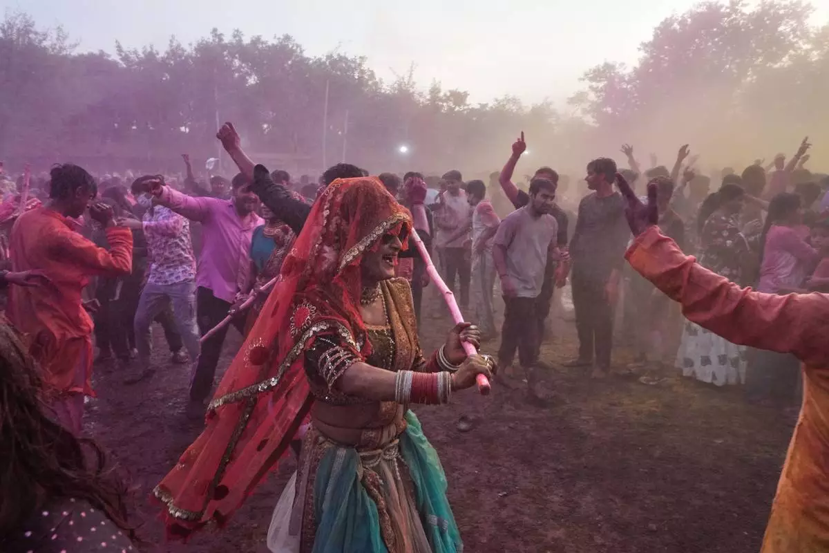 2026年2月27日,印度馬圖拉,灑紅節慶祝活動期間,女性信眾在室利克里希納誕生地廟建築群內,象徵性地用木棍擊打男性,以慶祝棍棒灑紅節。(美聯社圖片/Manish Swarup) AP圖片