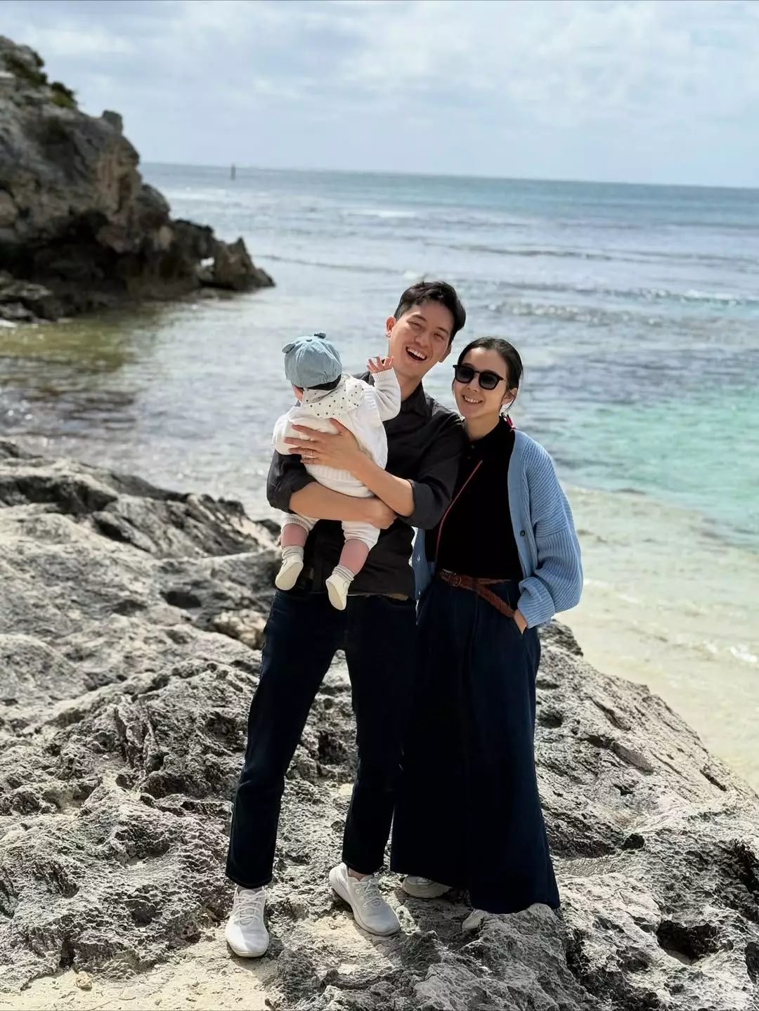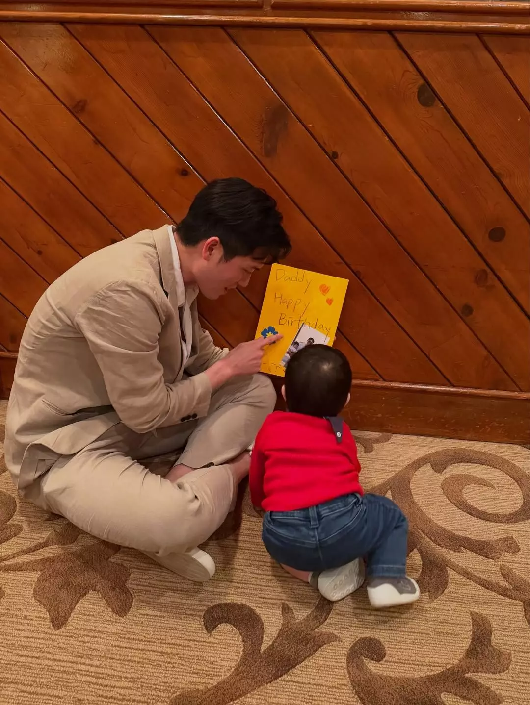 盛勁為晒出與老婆及生日蛋糕的合照,可見二人齊齊穿上藍色衫,麥明詩坐在老公大腿上,盛勁為則環抱着老婆,二人一同露出微笑,畫面甜蜜又幸福滿!另一張相則見到盛勁為向快1歲大的囝囝展示寫着「Daddy Happy birthday」的生日卡,雖然明顯不是囝囝親手寫,但依然令他非常開心,父愛滿溢!