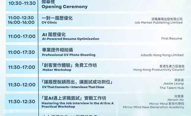 除焦點證件相服務外,現場亦設有多項實用支援,包括互動工作坊、人工智能履歷優化 、一對一履歷諮詢,為求職者分析履歷優劣、優化內容重點,提升面試命中率;「創業坊」提供與本地潛力初創企業家直接交流的機會,拓展人脈,激發創新思維。當日亦歡迎愛好科技與藝術的大學及大專院校學生參與「創客體驗活動」,在專業導師指導下操作3D打印機、雷射雕刻切割機等設備,親手完成從構思到實體製作的完整過程(需提前預約)。 此外,活動當日更會舉辦多場行業主題研討會,聚焦求職技巧及人工智能在職場的最新應用,協助參與者深入了解行業趨勢及職業發展方向,獲取寶貴見解,為求職之路加強助力。