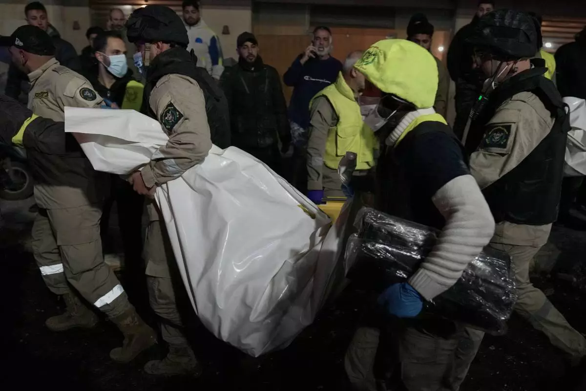 2026年3月2日,星期一,黎巴嫩貝魯特南部傑納赫區,救援人員從一棟遭以色列空襲擊中的建築物內,搬運一具裝在膠袋內的遺體。(美聯社圖片/Hussein Malla) AP圖片