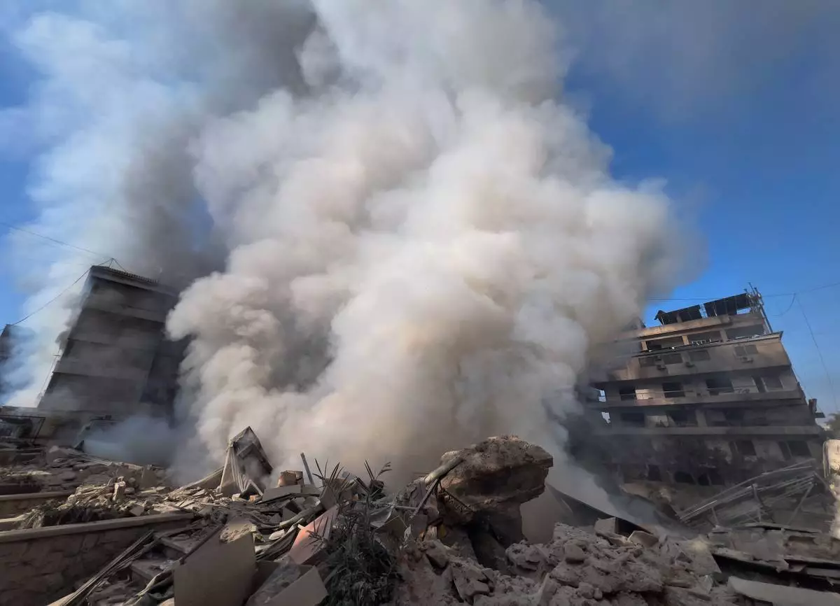 2026年3月3日,星期二,黎巴嫩貝魯特南部郊區達希耶,一棟遭以色列空襲擊中的被毀建築物冒出濃煙。(美聯社圖片/Hussein Malla) AP圖片