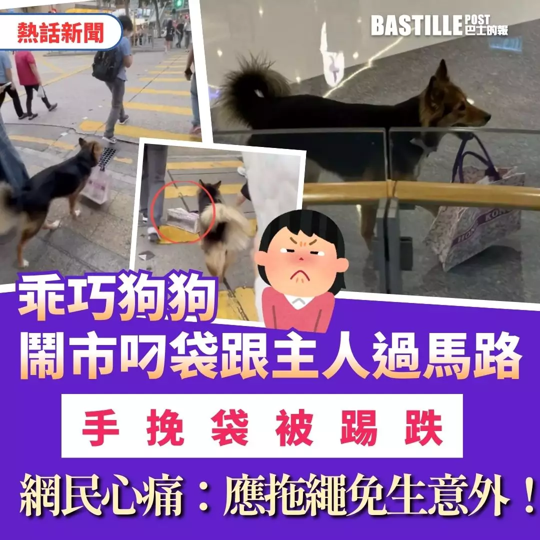 近日網上流傳一段影片,一隻狗狗乖巧地叼著手挽袋跟隨男主人過馬路,惟途中袋疑被途人踢跌,狗狗無助望向主人,影片上載者代為發聲:「邊個衰人踢跌佢個袋!」事件引發網民熱議,不少人讚賞狗狗可愛,同時提醒狗主應繫上狗繩保障安全。