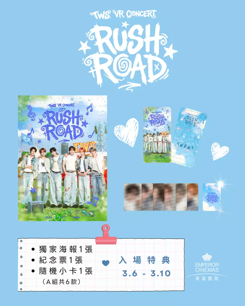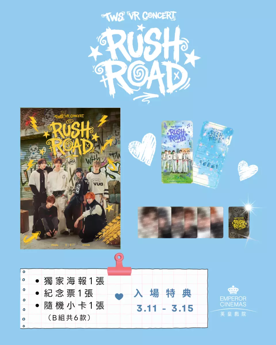 韓國新生代人氣男團TWS首部VR演唱會電影《TWS VR CONCERT : RUSH ROAD》即將登陸香港!充滿青春能量的搖滾音樂節舞台。當音樂迸發而出的瞬間,非凡的日常之外,與TWS共赴的特別旅程就此開啟。