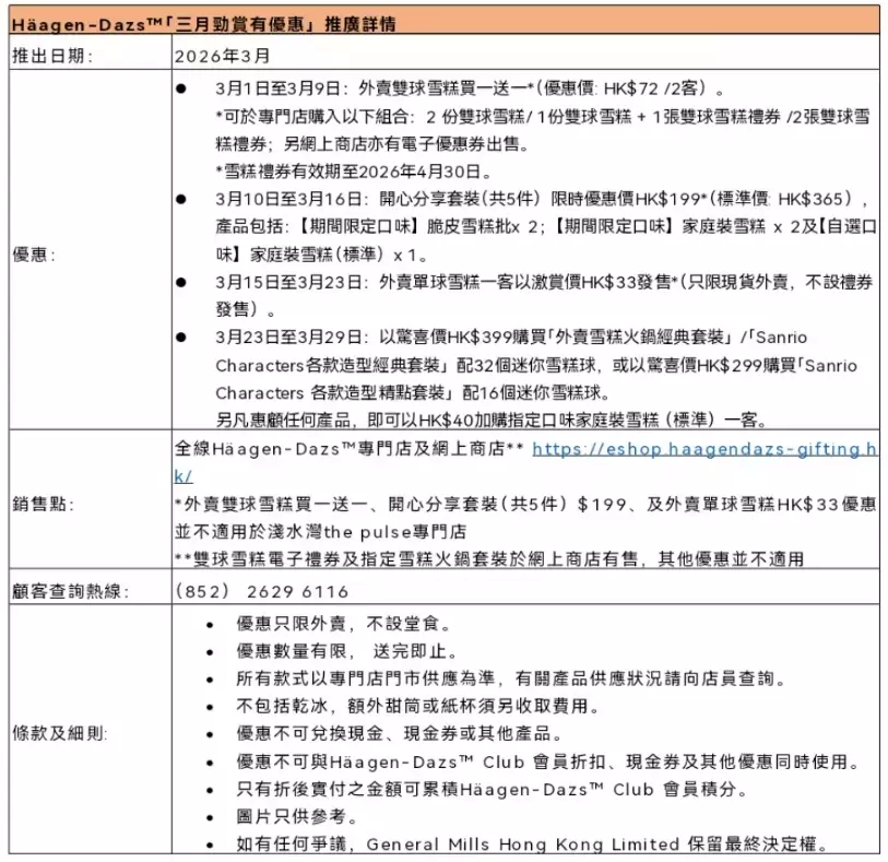 春意盎然的三月,正是品嚐甜蜜、共享美好時光的最佳季節!Häagen-Dazs™由3月1日起精心呈獻「三月勁賞有優惠」,一連四星期帶來5重驚喜禮遇,邀請您與親朋好友一同享受幼滑細膩的雪糕體驗。限時優惠包括:外賣雙球雪糕買一送一強勢回歸、三客家庭裝雪糕組合低至55折、HK$33激賞價品嚐外賣單球雪糕、HK$40加購指定口味家庭裝雪糕(標準)以及指定外賣雪糕火鍋低至75折!部分優惠更於網上商店(https://eshop.haagendazs-gifting.hk/)同步推出,讓您隨時隨地輕鬆選購,盡情陶醉於每一口濃醇幸福!