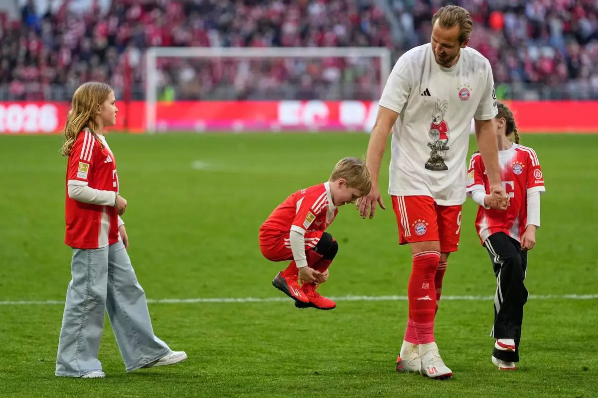拜仁球員哈利卡尼(Harry Kane)在球隊於德國慕尼黑舉行的德甲足球賽中擊敗史特加,鎖定德國聯賽冠軍後,與子女一同離開。攝於2026年4月19日周日。(美聯社圖片/馬蒂亞斯·施拉德) AP圖片
