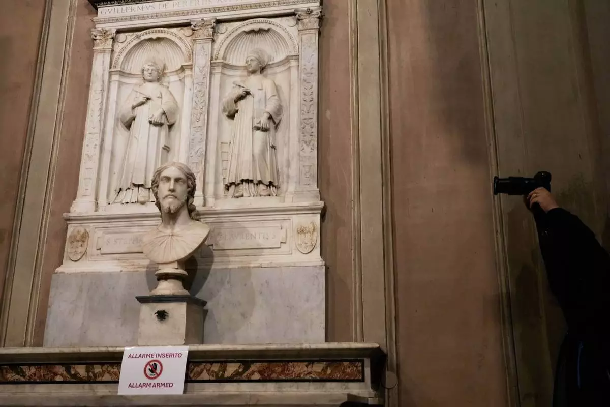 羅馬城外聖依搦斯聖殿內的大理石半身像,意大利研究員華倫天娜·薩勒諾的新研究指出,該作品可能重新歸於米高安哲羅·博那羅蒂名下。攝於2026年3月4日周三。(美聯社圖片/格雷戈里奧·博爾吉亞) AP圖片