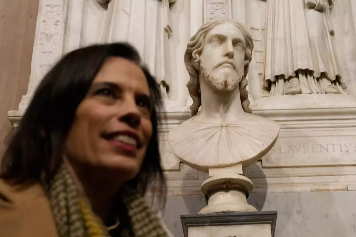 意大利研究員華倫天娜·薩勒諾周三(2026年3月4日)在意大利羅馬城外聖依搦斯聖殿內的大理石半身像旁,擺姿勢讓攝影師拍照。新研究指出該作品可能重新歸於米高安哲羅·博那羅蒂名下。(美聯社圖片/格雷戈里奧·博爾吉亞) AP圖片