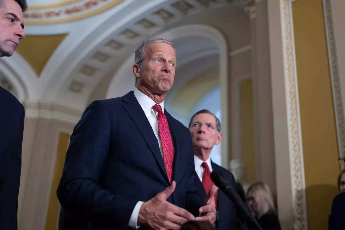 參議院多數黨領袖桑恩(John Thune)(中),在參議員科頓(Tom Cotton)(左)及參議員巴拉索(John Barrasso)陪同下,周二(2026年4月21日)在華盛頓國會山莊舉行閉門黨團會議後向記者發言。(美聯社圖片/J. Scott Applewhite) AP圖片