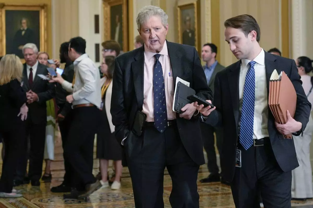 參議員甘迺迪(John Kennedy)(中)周二(2026年4月14日)在華盛頓與記者交談。(美聯社圖片/Mariam Zuhaib) AP圖片