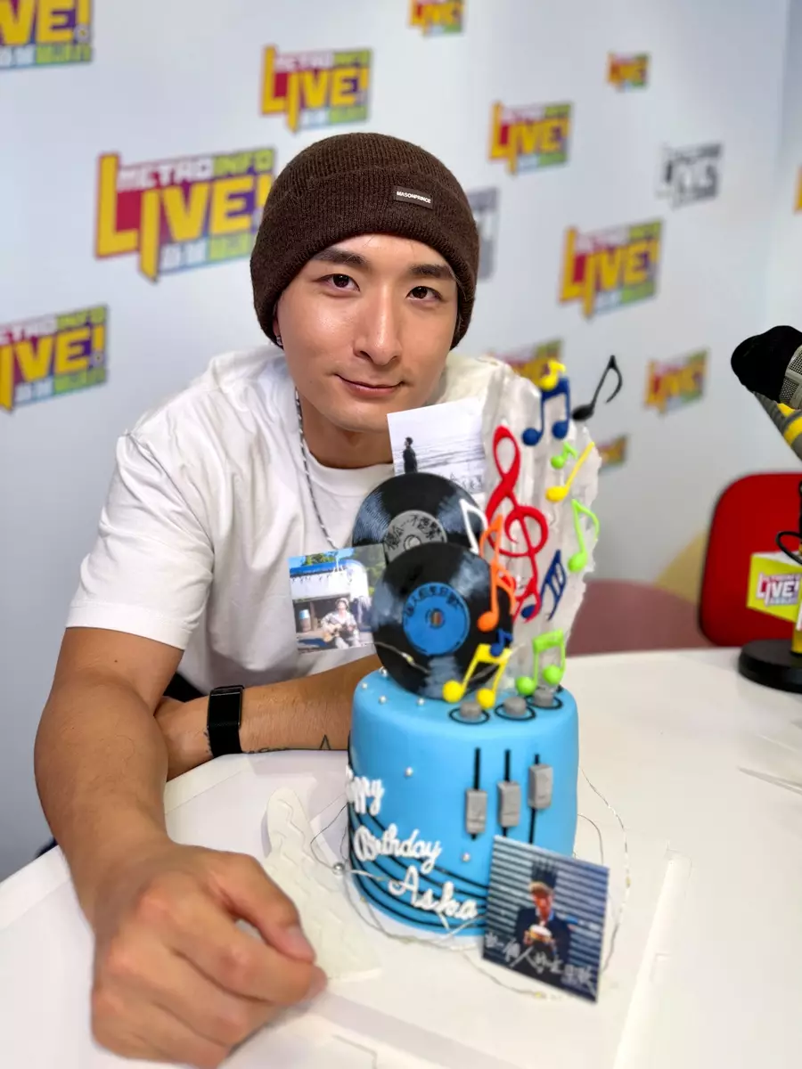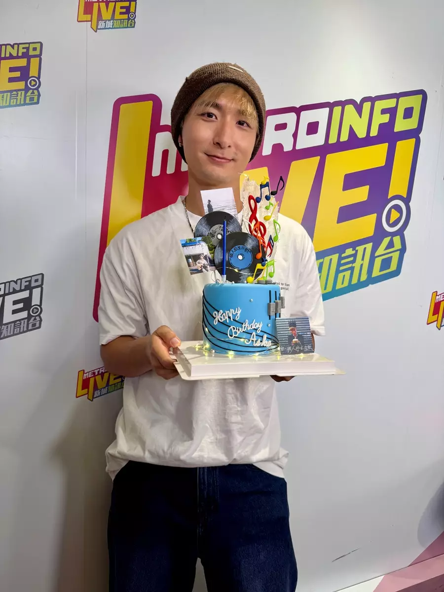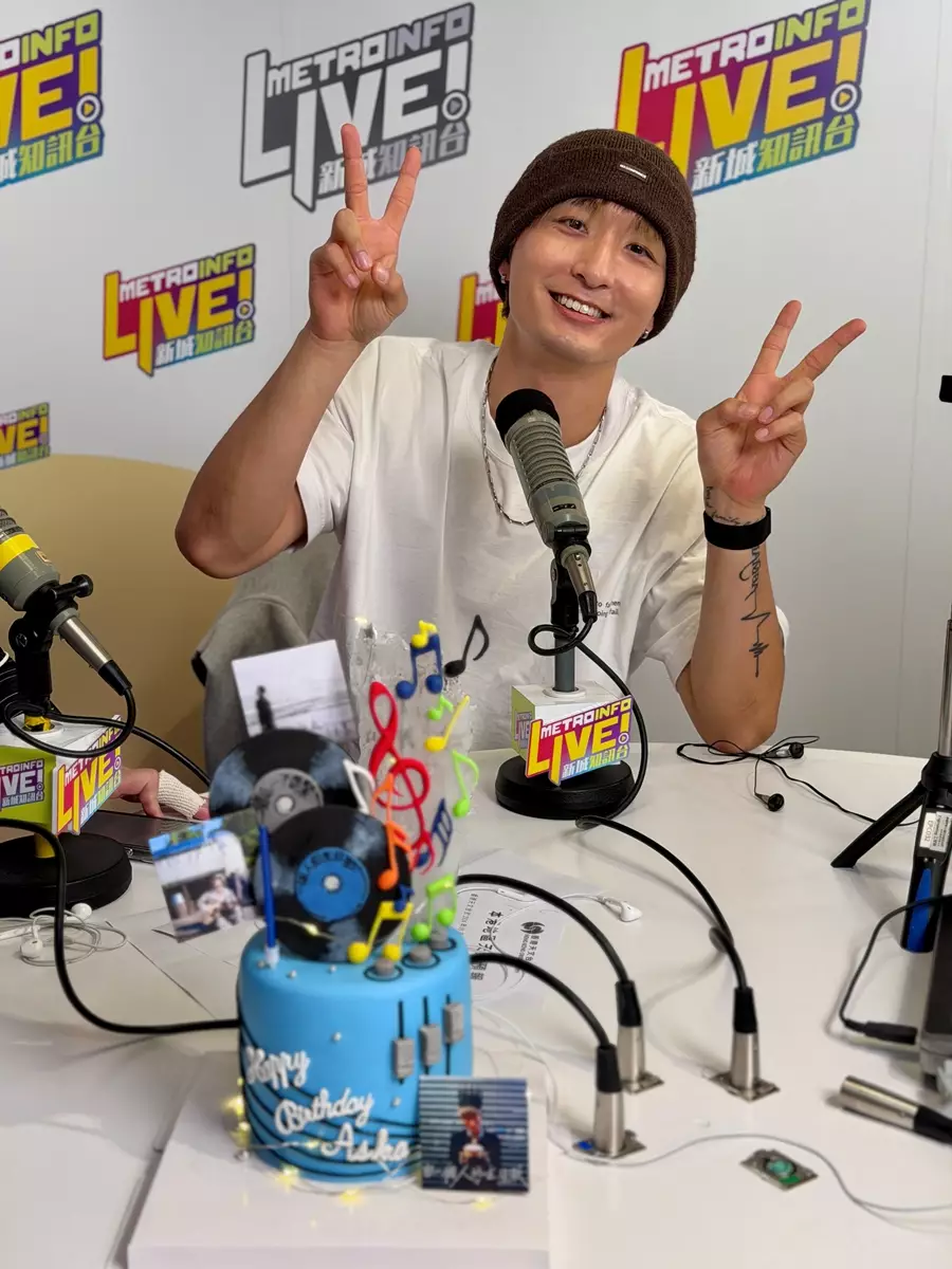 而今早,Aska精神奕奕再繼續現身新城接受知訊台台長程凱欣、麥卓華主持的《原來生活好快樂》節目訪問,台長並送上桃壽蛋糕及利是祝賀壽星。