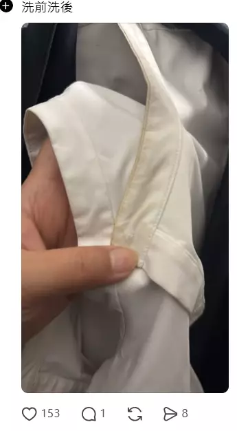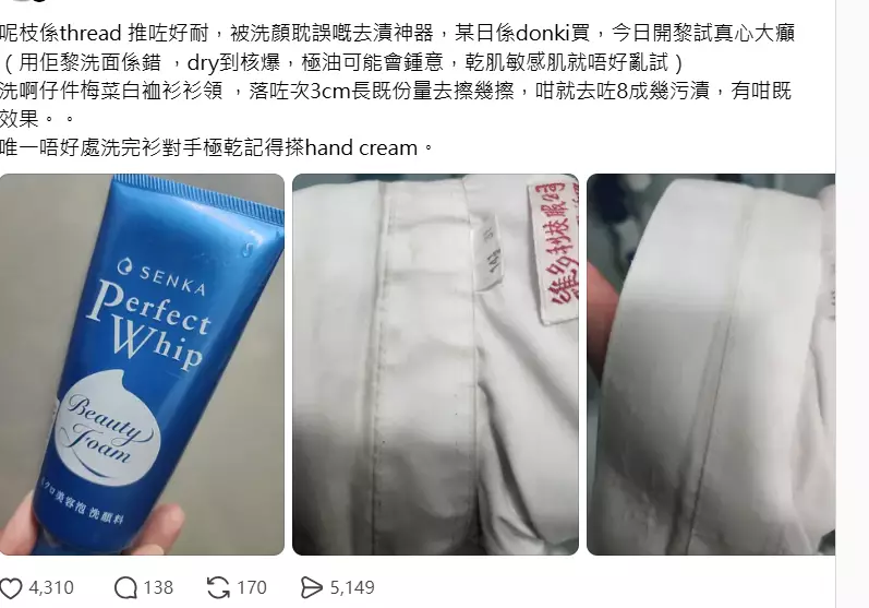 除了用來洗鞋,有網民就挑戰清潔白裇衫衫領,由於白裇衫最難洗的就是衣領及腋下位置的頑固汗漬,但網友話「落咗次3cm長既份量去擦幾擦,咁就去咗8成幾污漬」更上載清潔前後的相片,力證洗面奶的神奇!網友還笑稱這個「被洗顏耽誤嘅去漬神器」唯一「唔好處」就是「洗完衫對手極乾」提醒大家「記得搽hand cream。」