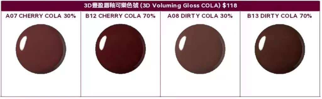 3D豐盈唇釉可樂色號延續品牌產品標誌性的強烈的水潤玻璃光澤,令雙唇瞬間飽滿水潤,撫平唇紋與乾燥,呈現晶瑩剔透的水光效果。透明凝膠質地輕盈不黏膩,於唇面形成保護膜,持久顯色數小時。系列更提供30%清透自然與70%飽滿顯色兩種濃度選擇,前者打造自然唇妝效果,後者則呈現鮮明時尚的唇色。