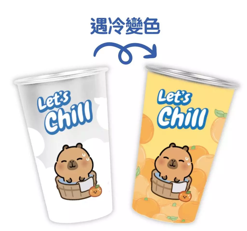 水豚泡溫泉是日常,小黃豚今次在鋁質變色杯上頂着蜜柑,可愛演譯坐在小浴盤泡溫泉。注入常溫水時保持白色杯身,當注入冷水時即「隨機應變」變成醒目的橘子色及蜜柑背景,跟主題互相呼應!