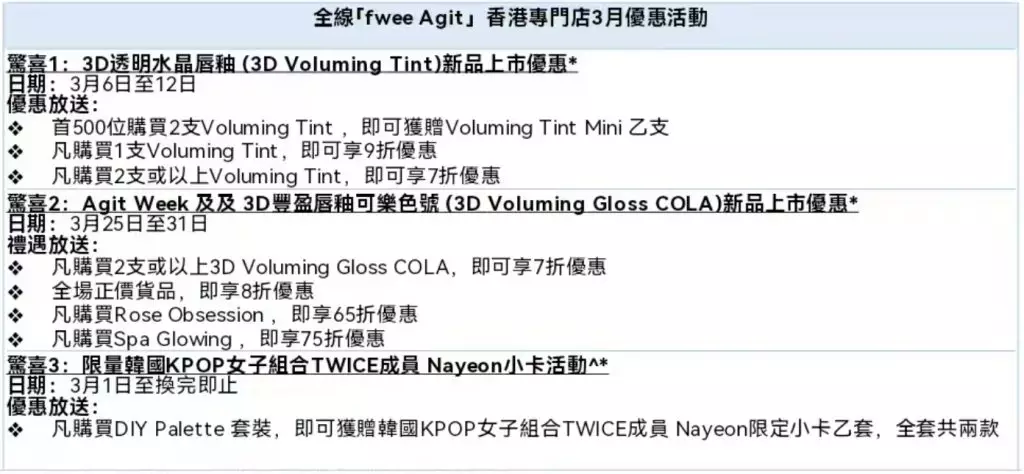 為慶祝新品隆重登場,全線「fwee Agit」香港專門店於3月推出兩大階段優惠活動,由3月6 日至3月12日,新品上市首星期,推出三大優惠,包括贈送Voluming Tint Mini 、享7折或9折優惠。而3月份的Agit Week 將會於3月25日至3月31日,一連七日Agit Week為大家帶來3D Voluming Gloss COLA 7折優惠、全場正價貨品8折優惠,指定產品更抵至65折優惠,讓你輕鬆購入美妝好物打造專屬春日妝容。